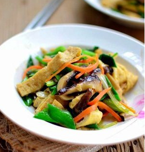 豆腐皮1块、芹菜250克、盐适量。起油锅,将豆腐皮放入锅中,用中火炸至豆腐皮表皮起泡即可取出,用刀切成小块状备用。将芹菜的叶片择去,洗净后切成约2.5厘米长段备用。烧热锅,加入1大匙油,放入芹菜段、豆腐皮,快速拌炒均匀。加入调味料及少许水,慢慢娴煮至豆腐皮变软即可。